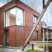 mit der markant rost-roten Stahlfassade